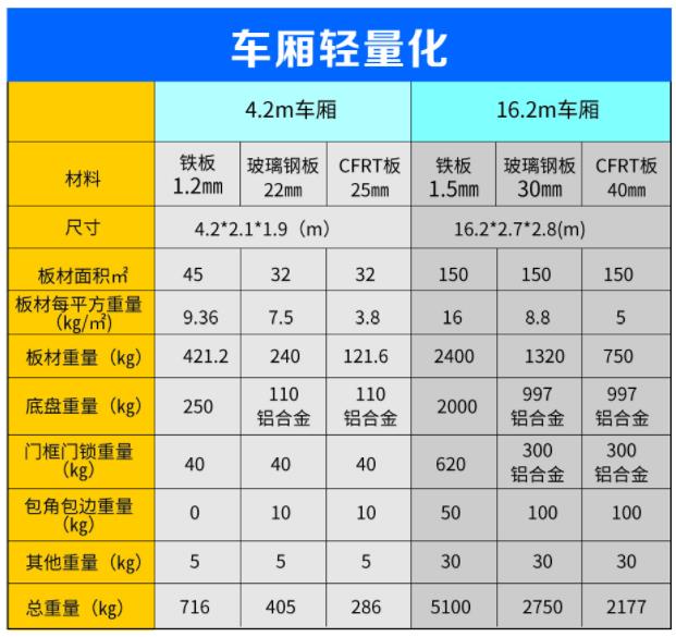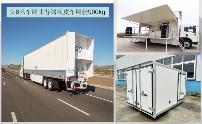 9.6米的車廂,相比傳統(tǒng)的鐵皮車廂整備輕900kg,多鳴三明治復(fù)合板材的使用,使得車輛輕質(zhì)高強(qiáng)、易組裝、節(jié)約成本、耐候性強(qiáng)、抗化學(xué)腐蝕、環(huán)??苫厥?!