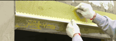 然后在窗口小四面角用玻纖網(wǎng)加強(qiáng),尺寸為400mm*聚苯板厚度,窗洞口四角處沿45度方向,加鋪400mm*200mm增強(qiáng)玻纖網(wǎng)。