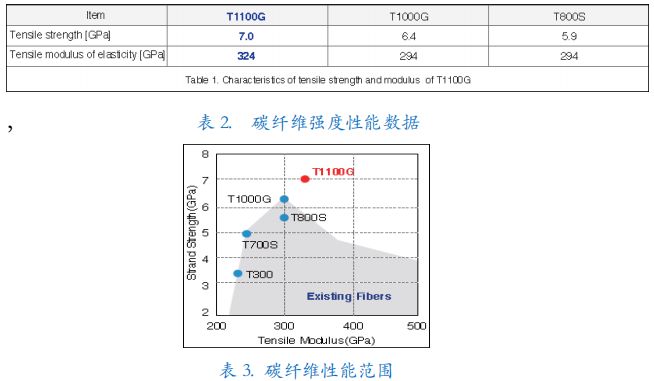 T1100 碳纖維使用了東麗定量技術(shù),達(dá)到精細(xì)級(jí)控制纖維結(jié)構(gòu)。結(jié)果是顯著的性能改進(jìn)超過(guò)東麗的其他碳纖維,見表 2.和表 3.