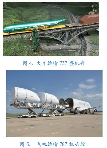 Spirit AeroSystems(美國(guó)堪薩斯州的威奇塔)她收購(gòu)了,波音公司在威奇塔的飛機(jī)部件制造廠。目前是世界第一大的飛機(jī)部、組件制造公司。其中最突出的是:目前她每月至少要向波音公司 737 在西雅圖的倫頓總裝廠,提供 50 個(gè) 737 整機(jī)身。737 整機(jī)身用火車,由威奇塔運(yùn)輸?shù)絺愵D總裝廠(圖。4)。每月至少向波音 787 總裝廠交付 16-17 架 787 機(jī)頭段。機(jī)頭段用飛機(jī)運(yùn)輸(圖。5)。